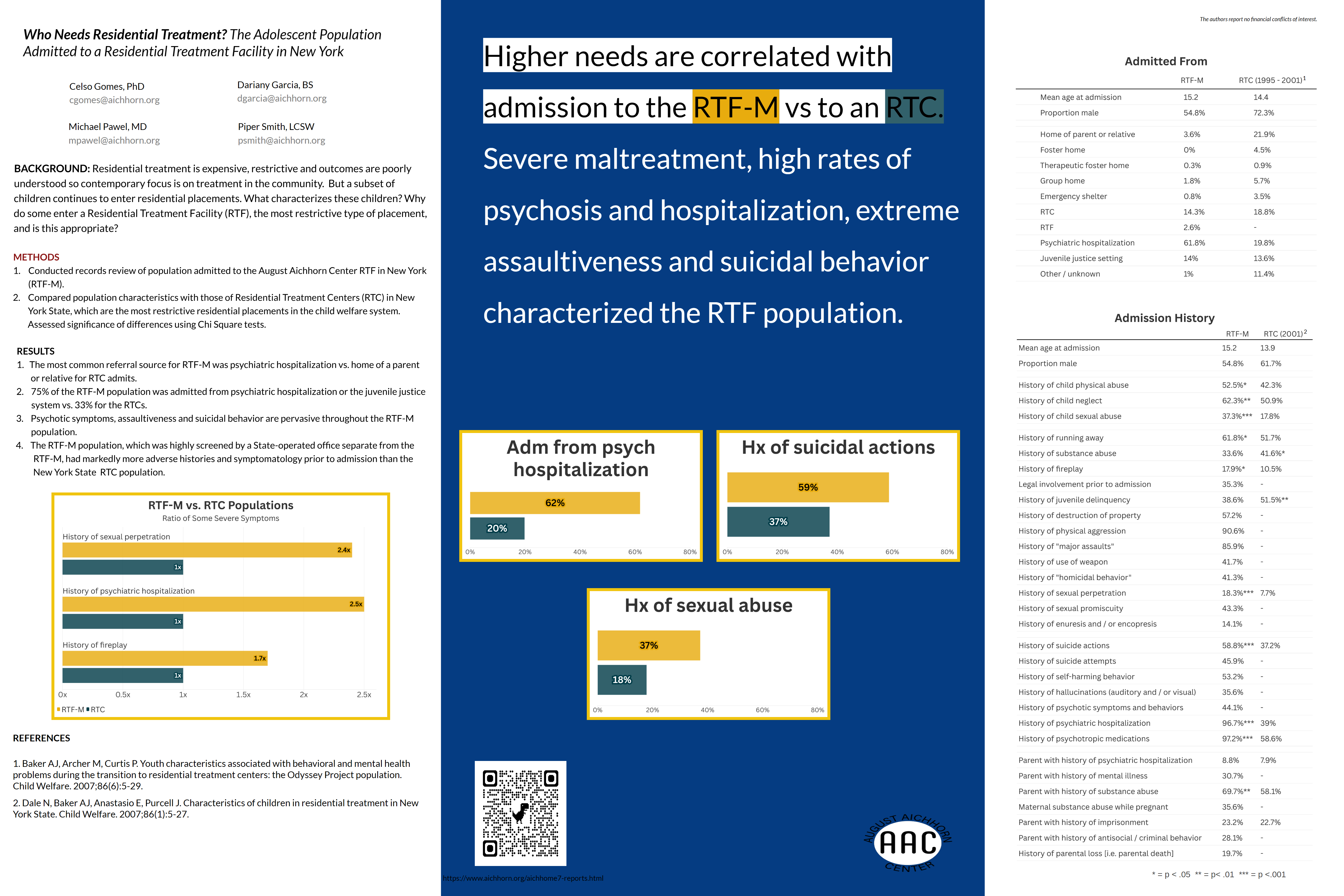 A poster exhibited at the American Academy of Child and Adolescent Psychiatry annual conference of 2025 highlights the differences in symptom severity between youngsters admitted to foster care Residential Treatment Centers in New York State and those admitted to the RTF-M. (To enlarge click here. )